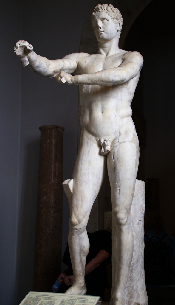 This image shows a Roman marble copy of an original bronze statue by the ancient Greek artist Lysippos.